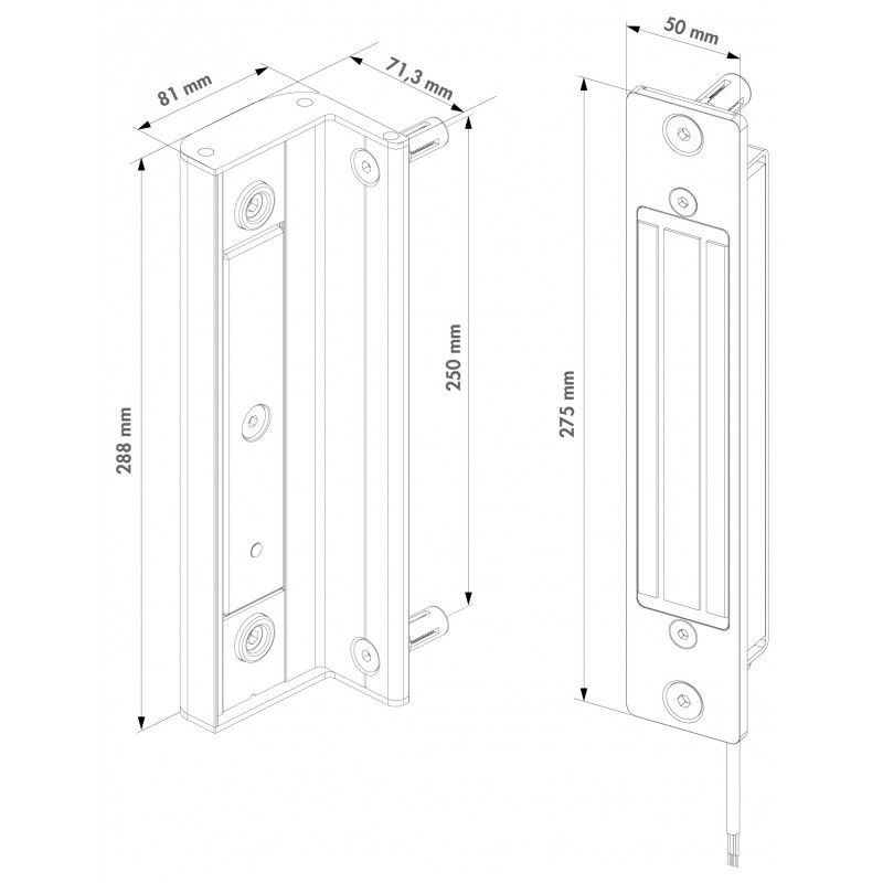 Ventouse électromagnétique à ENCASTRER - LOCINOX B-MAG, force de traction 2500N (250Kg), résistance au brouillard salin certifiée SGS ISO9227, alimentation 12/24Vdc, consommation 460mA/230mA, fixation QUICK-FIX, dimensions support contre-plaque288x81x71.3mm, dimensions ventouse 275x50mm, entraxe perçage 250mm, réservation encastrement 225x42mm