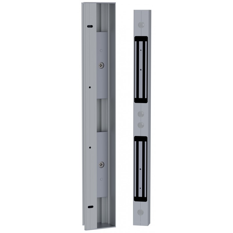 Bandeau poignée aluminium SEWOSY CPREG2N avec 2 ventouses force de rétention 2 x 300 daN, longueur 600 mm, finition SATINE, dimensions (L x l x P) : 600 x 90.4 x 70.35 mm, largeur bandeau ventouse 43.10mm, indice de protection IP42, alimentation 12/24VDC, consommation 960/520mA (12.5W), contact d'état NO/NF max 30Vsc/0.2A, bouchon en ABS coloris gris alu, certifié NF S 61-937 (24V)
